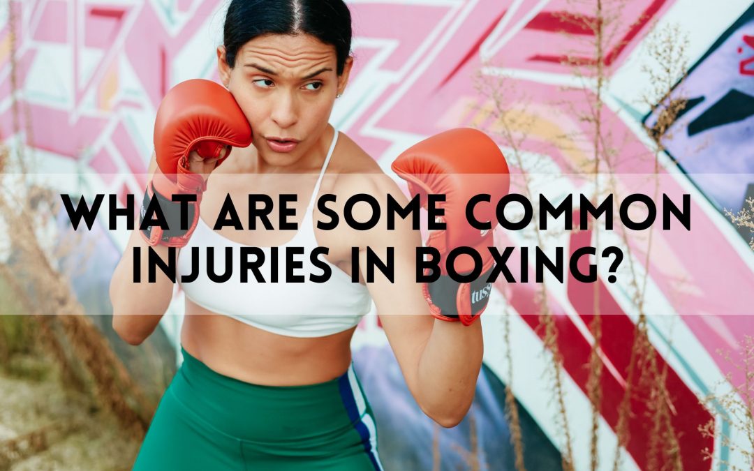 Female boxer in a defensive stance wearing red gloves in front of a graffiti wall, with the text "What Are Some Common Injuries in Boxing?" displayed across the image.